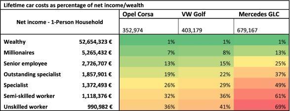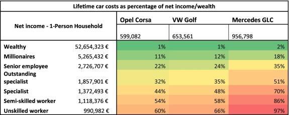 Questi dati vengono poi confrontati con il reddito in modo da valutare l’impatto che avere ed utilizzare un’auto ha nel corso della vita. Per le categorie sociali più ricche, come prevedibile, l’impatto è minimo. Per i lavoratori a basso reddito, invece, anche una semplice city car può rappresentare più di un investimento pari a più di un terzo dei propri guadagni. Lo studio chiarisce come i lavoratori a basso reddito abbiano la possibilità di ridurre l’impatto del costo dell’auto. Per quest’obiettivo è possibile, ad esempio, ridurre la percorrenza annuale (riducendo i costi legati all’utilizzo) oppure unire due fonti di reddito (ad esempio i redditi di due coniugi) per coprire i costi dell’auto).