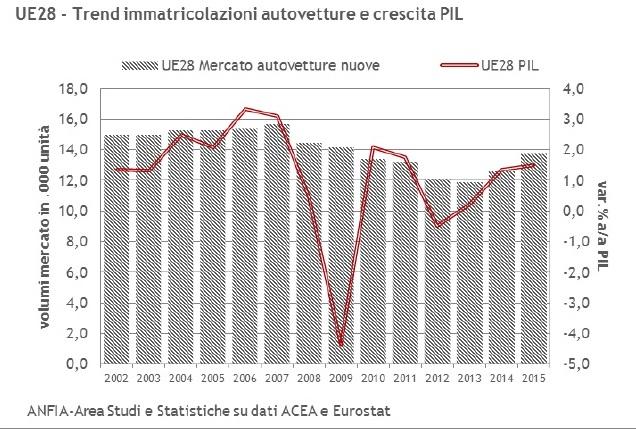 Nel 2015 sono state immatricolate 14, 2 milioni di auto, in crescita ma ancora lenta rispetto ai massimi del 2007