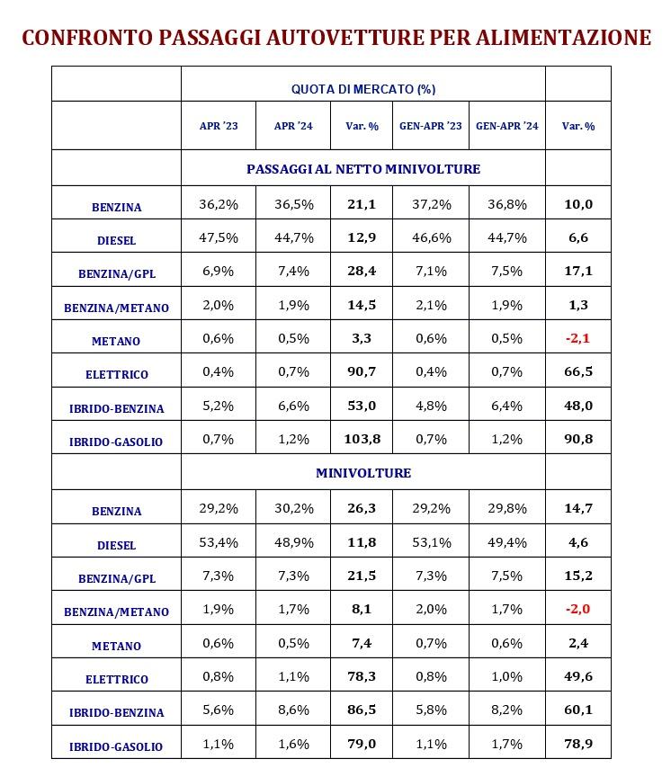Un dato interessante riguarda le radiazioni di autovetture, che hanno registrato un aumento significativo del 32,6% rispetto ad aprile 2023. Il tasso unitario di sostituzione risulta pari a 0,67 (ogni 100 auto nuove ne sono state radiate 67) e a 0,71 nei primi quattro mesi dell’anno.