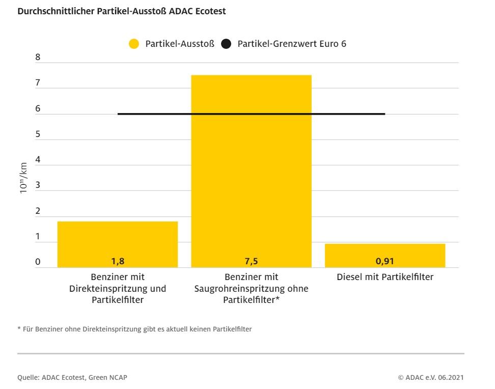 Le particelle PN delle auto a benzina con FAP sono superiori al numero medio di particelle emesse dalle auto con motore diesel e filtro antiparticolato. Ma il risultato eclatante è un altro. La norma attuale esonera le auto con motore benzina a iniezione indiretta (senza filtro) che emettono più particelle dei veicoli con filtro antiparticolato. “I valori limite non si applicano ai motori a benzina con iniezione a collettore!”, afferma l’ADAC. Dai risultati dei test Green NCAP su 136 modelli con motori a benzina e omologazione Euro 6d o Euro 6d-TEMP emerge che il numero medio di particelle (PN) con motori a benzina a iniezione diretta (120 modelli) è molto inferiore (1,8) rispetto ai 16 modelli con iniezione indiretta (7,5) come mostra l’immagine sopra.
