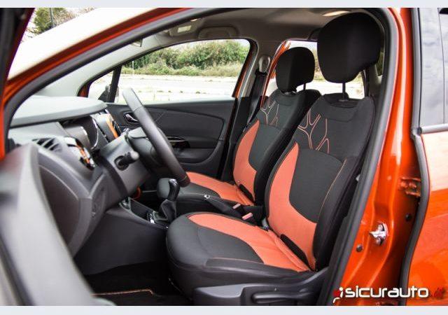 INTERNI – La plancia ha un design moderno e piacevole: discreta la qualità dei materiali utilizzati. Al centro della plancia vi è un comodo vano portaoggetti; al di sotto troviamo l’hazard e il pulsante per azionare la chiusura centralizzata. A questo punto troviamo il navigatore e ai suoi lati le bocchette di aerazione. Sotto al navigatore si trovano i comandi dell’aria condizionata. Nella parte bassa della plancia ci sono gli ingressi Aux-in e USB. Il quadro strumenti è caratterizzato da un’ottima visibilità; sono presenti due indicatori circolari, contagiri e indicatore livello carburante, tra i quali trova spazio il tachimetro digitale(avremmo preferito una classica visualizzazione a lancetta che, come noto, rende più facile leggere le informazioni); manca l’indicatore di temperatura del liquido di raffreddamento. Il volante ha una buona ergonomia anche se parte dell’impugnatura è in plastica; presenti i comandi del cruise control sullo sterzo e della radio su un piccolo satellite. Davanti al passeggero il vano portaoggetti non ha il classico sportello ma si apre come un cassetto. I sedili sono con doppio rivestimento sfoderabile grazie ad una cerniera e al velcro (le tonalità sono competamente nero e nero e arancione e sono un'ottima alternativa ai vecchi coprisedili che tanto andavano di moda negli anni 80); sugli schienali dei sedili anteriori invece delle tasche portaoggetti ci sono delle corde arancioni.
